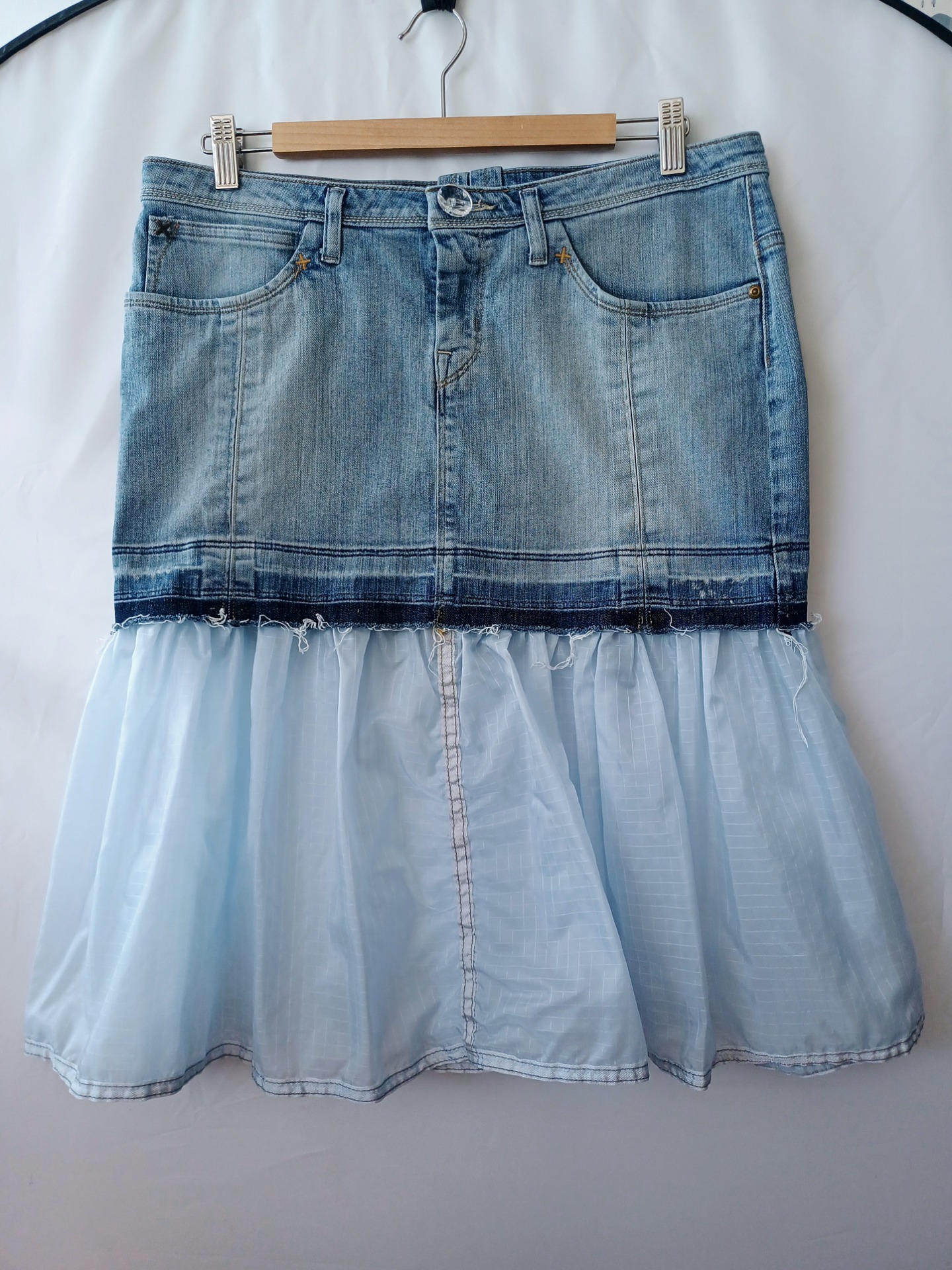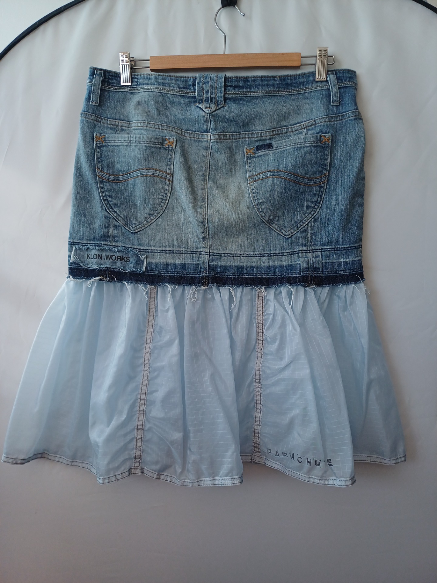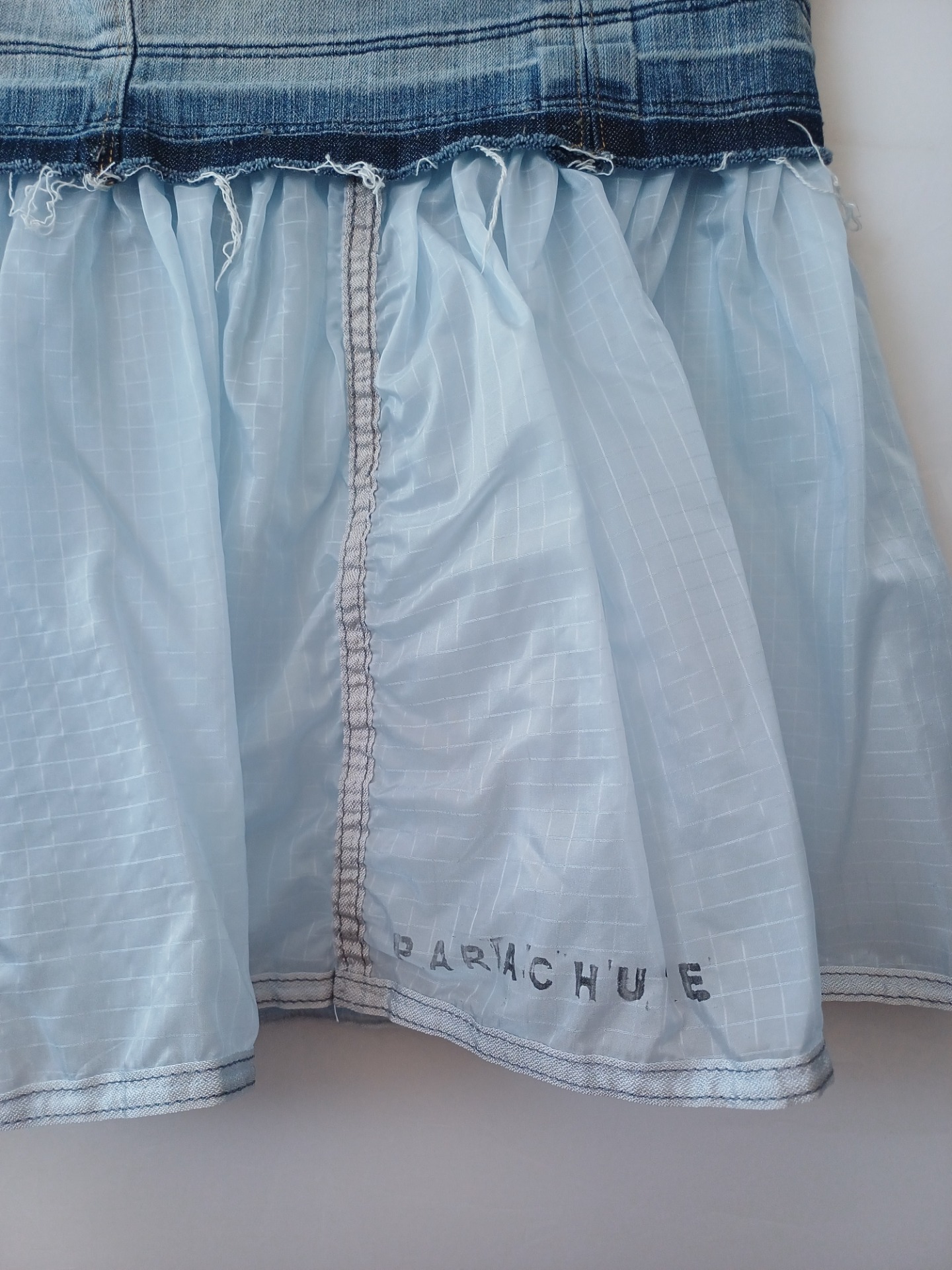 A skirt made from a discarded military parachute and old jeans.