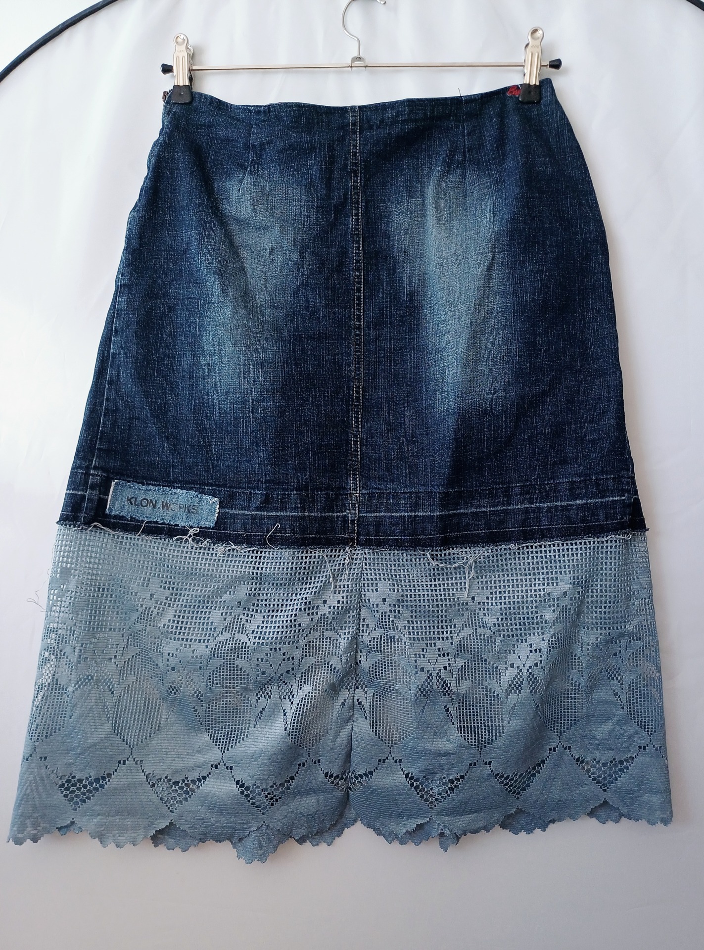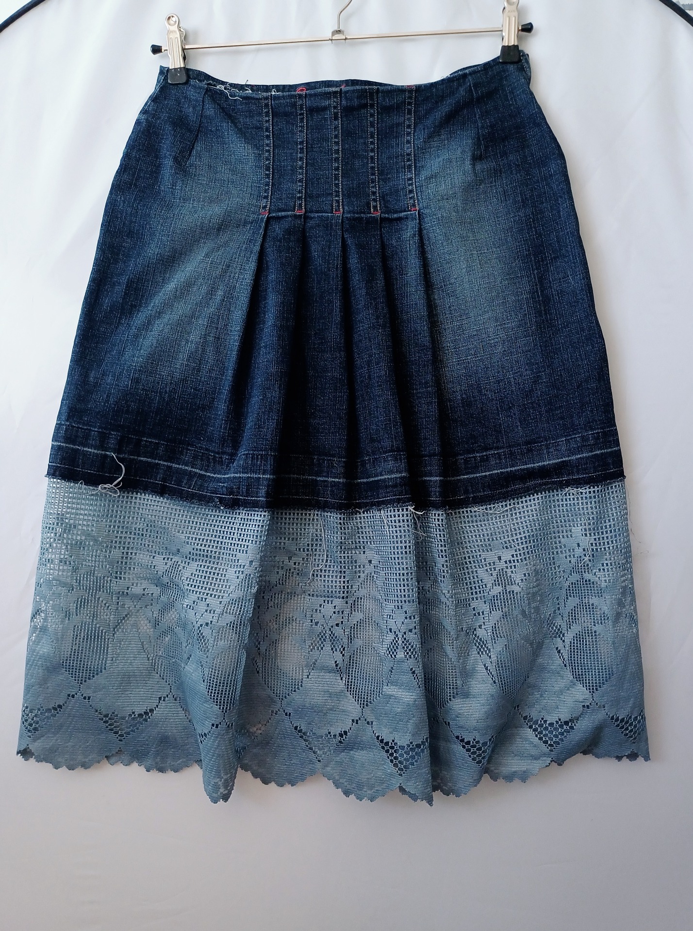 Džínová vintage minisukně doplněná barvenou záclonou.