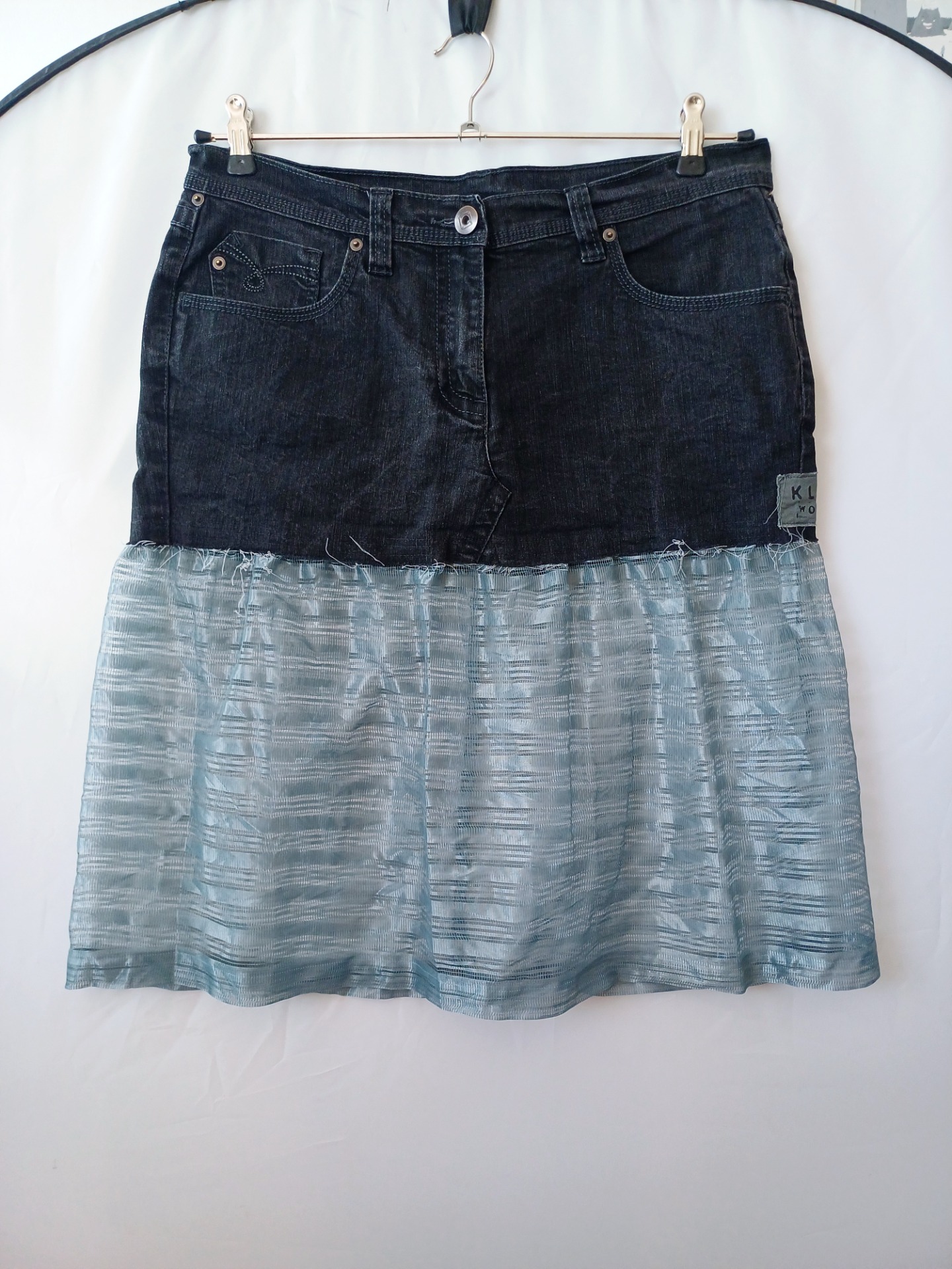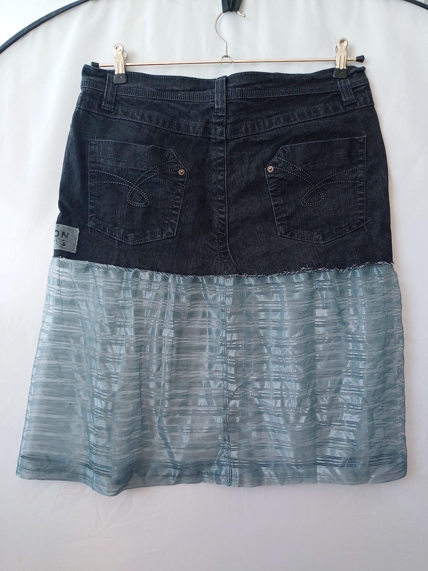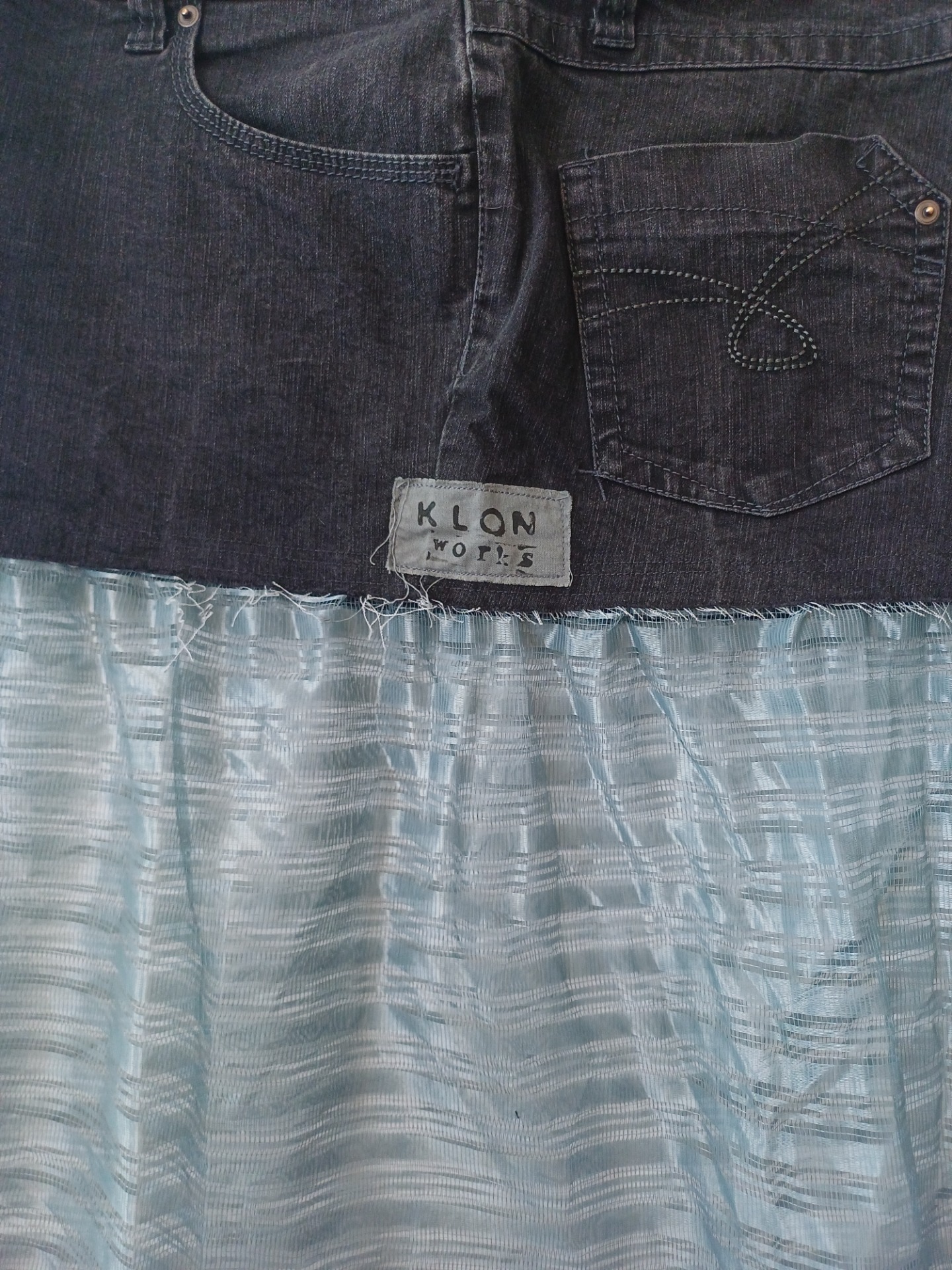 Džínová vintage minisukně doplněná záclonou.